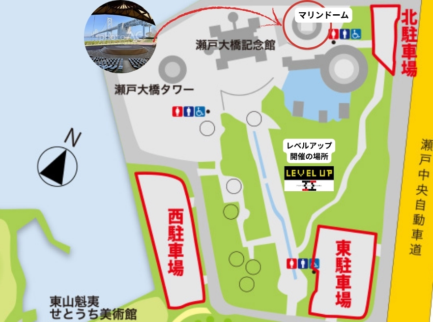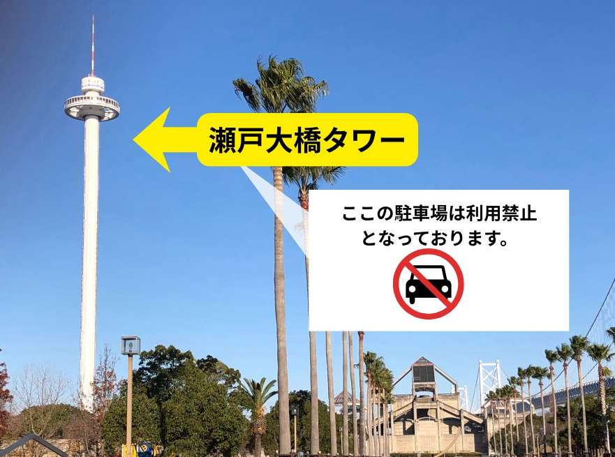 瀬戸大橋タワー周辺の駐車場を利用することはできません。絶対に停めないようにお願いいたします。係りの方がチェックしています。